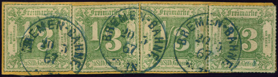 | Zusatzinformationen und Suchstichworte: | 75. AAK Phila GmbH Auktion 9. September 2022 Los 1557 D Altdeutschland Thurn und Taxis 1/3 Sgr dkl´gelbl´grün im teils angetrennten waagr. 4er-Streifen a. wunderschönem Bfstck. m. 3x zentr. blauem K1 BREMEN BAHNF., gepr. Diena u. m. einwandfreiem Attest BPSB "Als Einheit von größter Seltenheit", RR Zuschlag 900,00 EUR |
