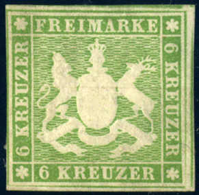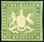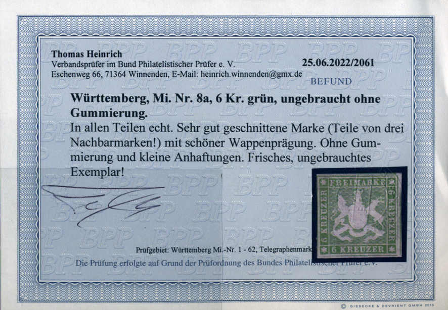 | Zusatzinformationen und Suchstichworte: | 75. AAK Phila GmbH Auktion 9. September 2022 Los 1604 (D) Altdeutschland Württemberg 6 Kr grün, ungebr. Luxus m. neuestem Befund Heinrich BPP "echt, sehr gut geschnitten, schöne Prägung, ohne Gummierung, kl. Anhaftungen, frisches Exemplar", Mi. f. * 1000€! Zuschlag 120,00 EUR |