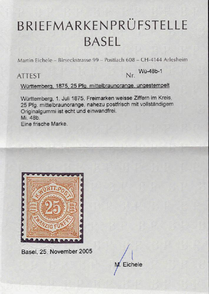| Zusatzinformationen und Suchstichworte: | 75. AAK Phila GmbH Auktion 9. September 2022 Los 1626 (D) Altdeutschland Württemberg 25 Pf mittelbraunorange, ungebr. Luxus (fast postfr.) m. einwandfreiem Attest BPSB, farbfrische Marke! Ausruf 100,00 EUR |