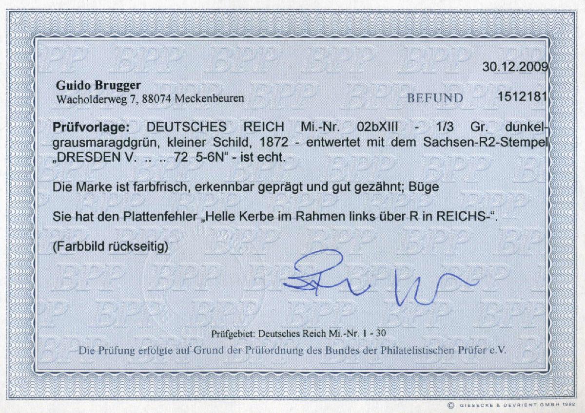 | Zusatzinformationen und Suchstichworte: | 75. AAK Phila GmbH Auktion 9. September 2022 Los 1688 (D) Deutsches Reich, 1872 Kleiner Brustschild 1/3 Gr kl. Schild in guter Farbe m. zentr. Sachsen-Ra2 DRESDEN m. PF "helle Kerbe im Rahmen" m. Befund Brugger BPP "echt, farbfrisch, erkennbar geprägt, gut gezähnt, Büge" Zuschlag 30,00 EUR |