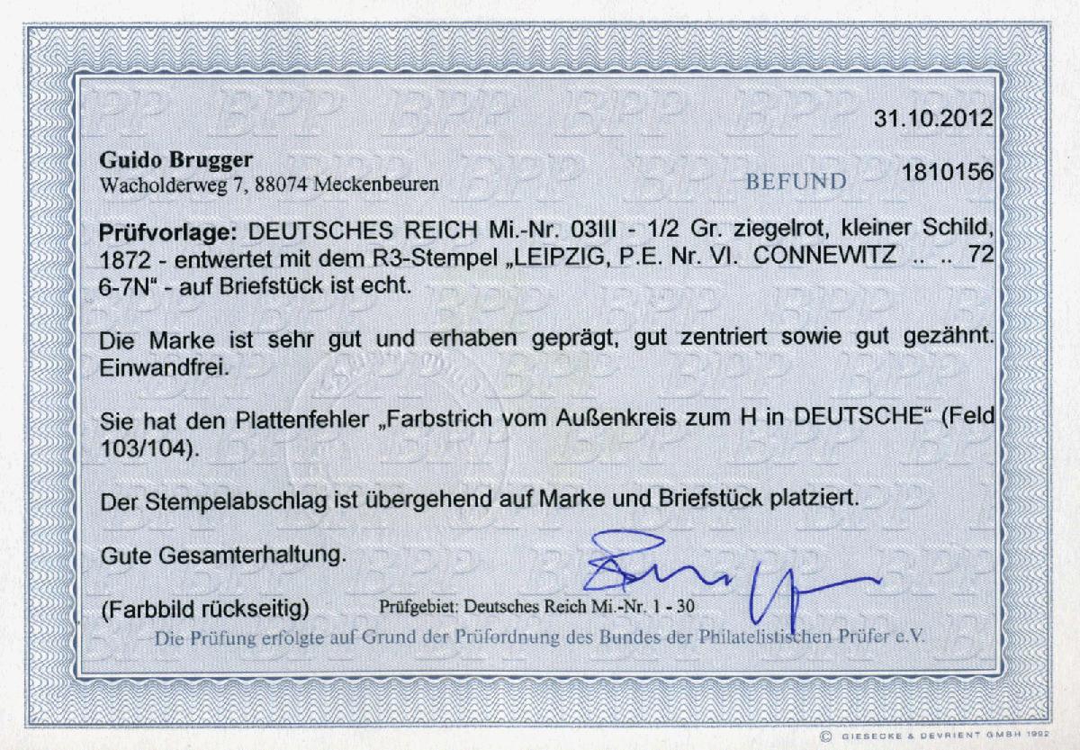 | Zusatzinformationen und Suchstichworte: | 75. AAK Phila GmbH Auktion 9. September 2022 Los 1695 (D) Deutsches Reich, 1872 Kleiner Brustschild 1/2 Gr kl. Schild m. Ra3 LEIPZIG CONNEWITZ m. PF "Farbfleck unter H" m. einwandfreiem Befund Brugger BPP "echt, gute Gesamterhaltung" Ausruf 20,00 EUR |
