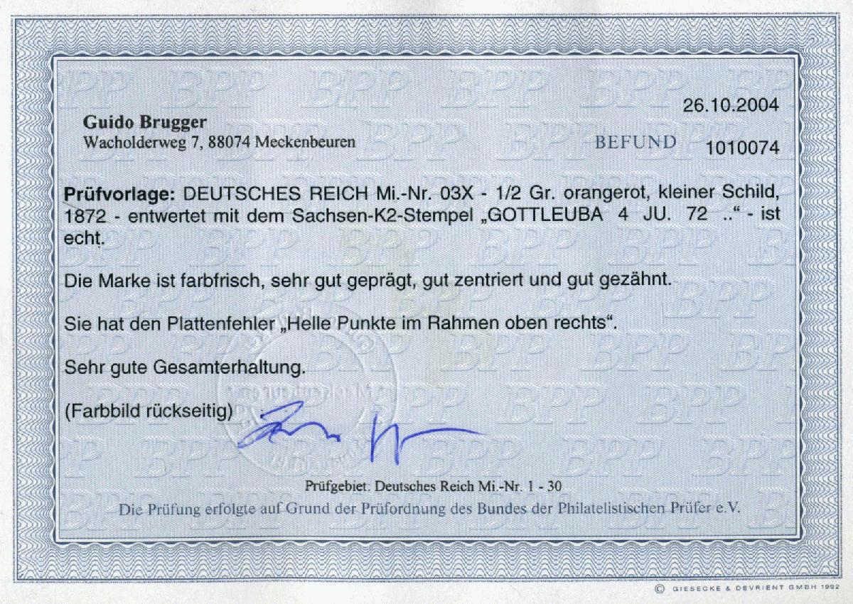 | Prüfgebiet: | Deutsches Reich 1871 - 1918 (Mi-Nr. 1 - 106) |