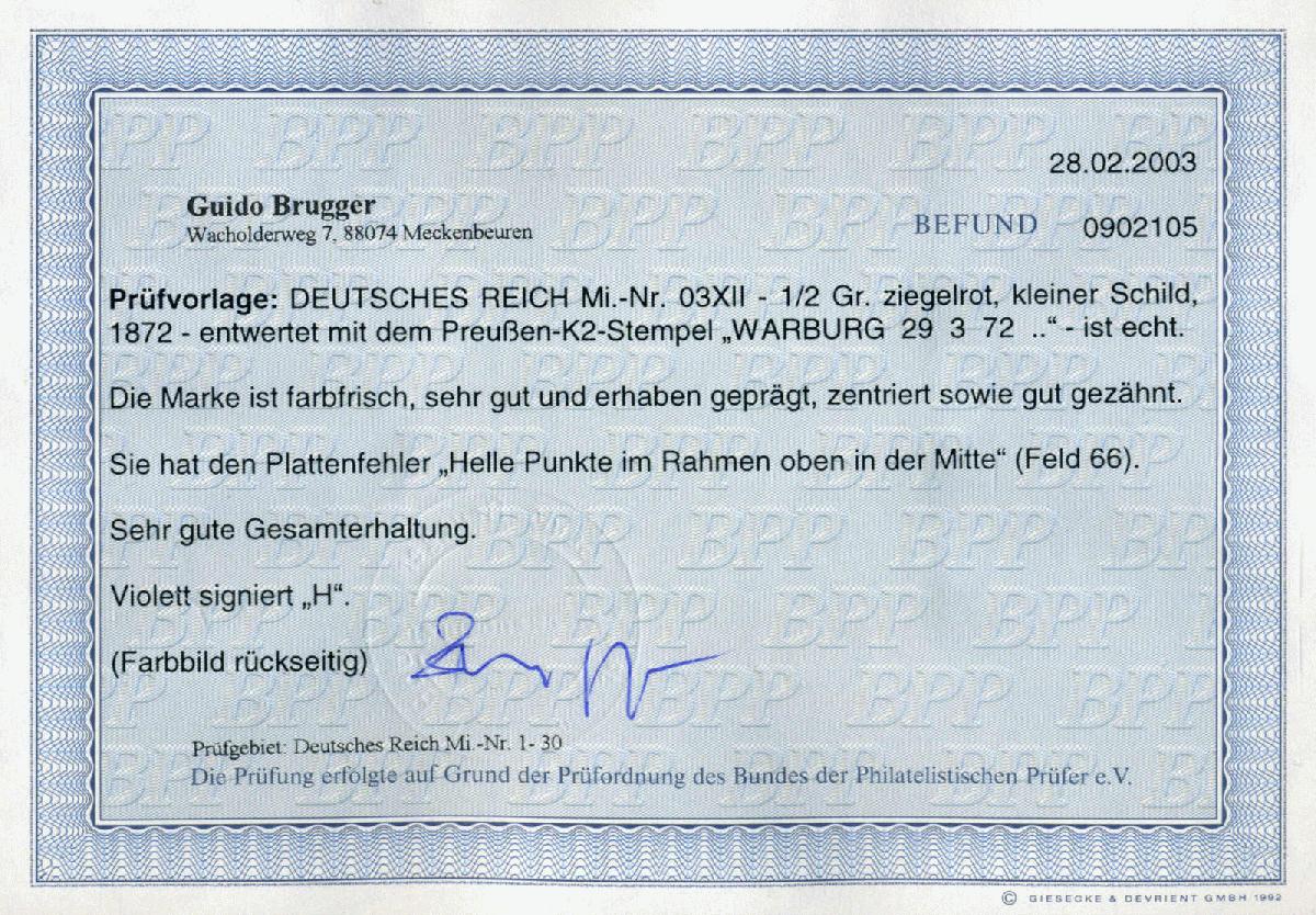 | Zusatzinformationen und Suchstichworte: | 75. AAK Phila GmbH Auktion 9. September 2022 Los 1704 (D) Deutsches Reich, 1872 Kleiner Brustschild 1/2 Gr kl. Schild m. zentr. Preußen-K2 WARBURG m. PF "helle Pkte. im Rahmen" m. einwandfreiem Befund Brugger BPP "echt, sehr gute Gesamterhaltung" Ausruf 30,00 EUR |