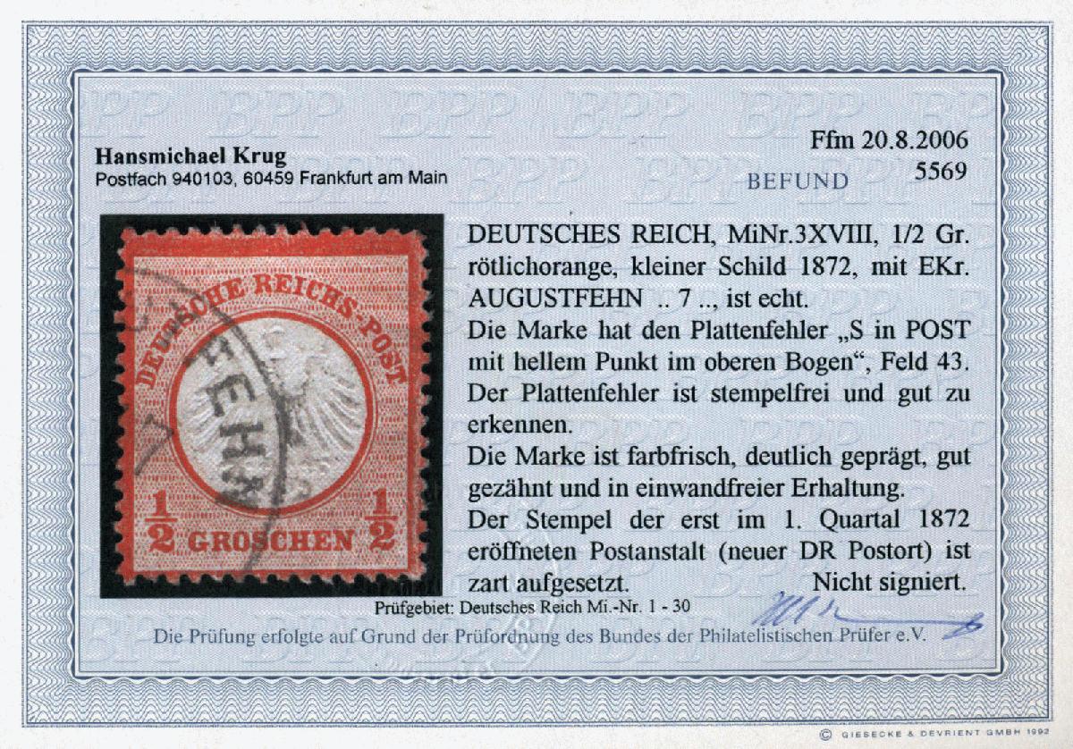 | Zusatzinformationen und Suchstichworte: | 75. AAK Phila GmbH Auktion 9. September 2022 Los 1706 (D) Deutsches Reich, 1872 Kleiner Brustschild 1/2 Gr kl. Schild m. K1 AUGUSTFEHN m. PF "Pkt. in S" m. einwandfreiem Befund Krug BPP "echt, farbfrisch, deutlich geprägt, gut gezähnt" Zuschlag 41,00 EUR |