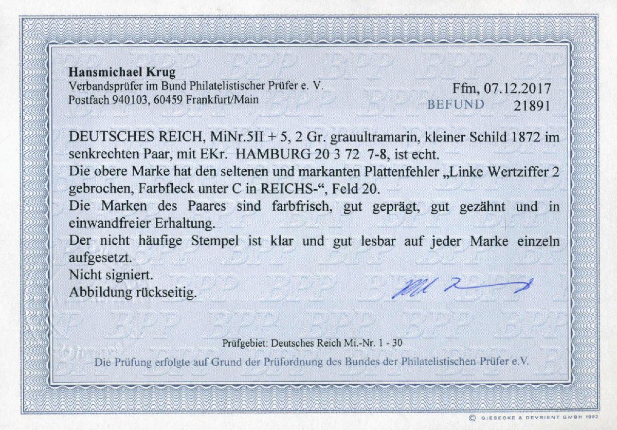 | Zusatzinformationen und Suchstichworte: | 75. AAK Phila GmbH Auktion 9. September 2022 Los 1724 (D) Deutsches Reich, 1872 Kleiner Brustschild 2 Gr kl. Schild im senkr. Paar m. 2x nicht häufigem zentr. K1 HAMBURG m. PF "li. 2 gebrochen" m. einwandfreiem Befund Sommer BPP "echt, farbfrisch, gut geprägt u. gezähnt" Zuschlag 75,00 EUR |