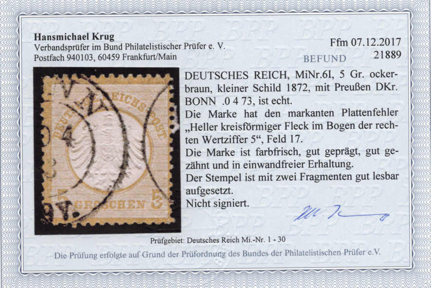 | Zusatzinformationen und Suchstichworte: | 75. AAK Phila GmbH Auktion 9. September 2022 Los 1731 (D) Deutsches Reich, 1872 Kleiner Brustschild 5 Gr kl. Schild m. Preußen-K2 BONN m. PF "Fleck in re. 5" m. einwandfreiem Befund Krug BPP Ausruf 60,00 EUR |