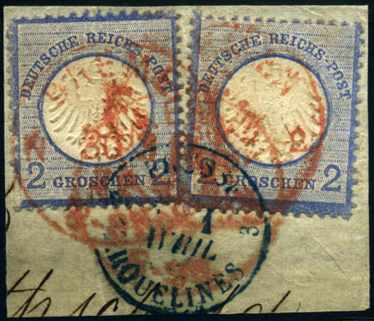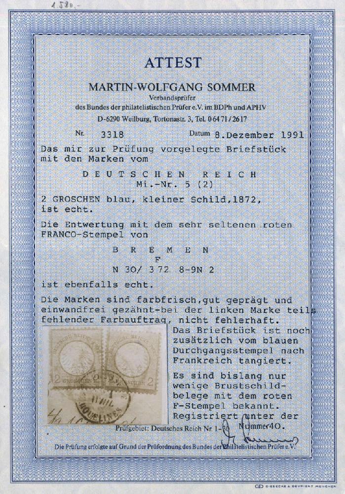 | Zusatzinformationen und Suchstichworte: | 75. AAK Phila GmbH Auktion 9. September 2022 Los 3821 (D) Deutsches Reich, 1872 Kleiner Brustschild "BREMEN N F.", seltener roter preußischer F-Stempel 2x a. Pracht-Bfstck. m. 2x 2 Gr kl. Schild m. FA Sommer BPP "echt, farbfrisch, gut geprägt, einwandfrei gezähnt, li. Marke fehlender Farbauftrag (nicht fehlerhaft), rote Entwertungen nur wenige bekannt", R Ausruf 150,00 EUR |