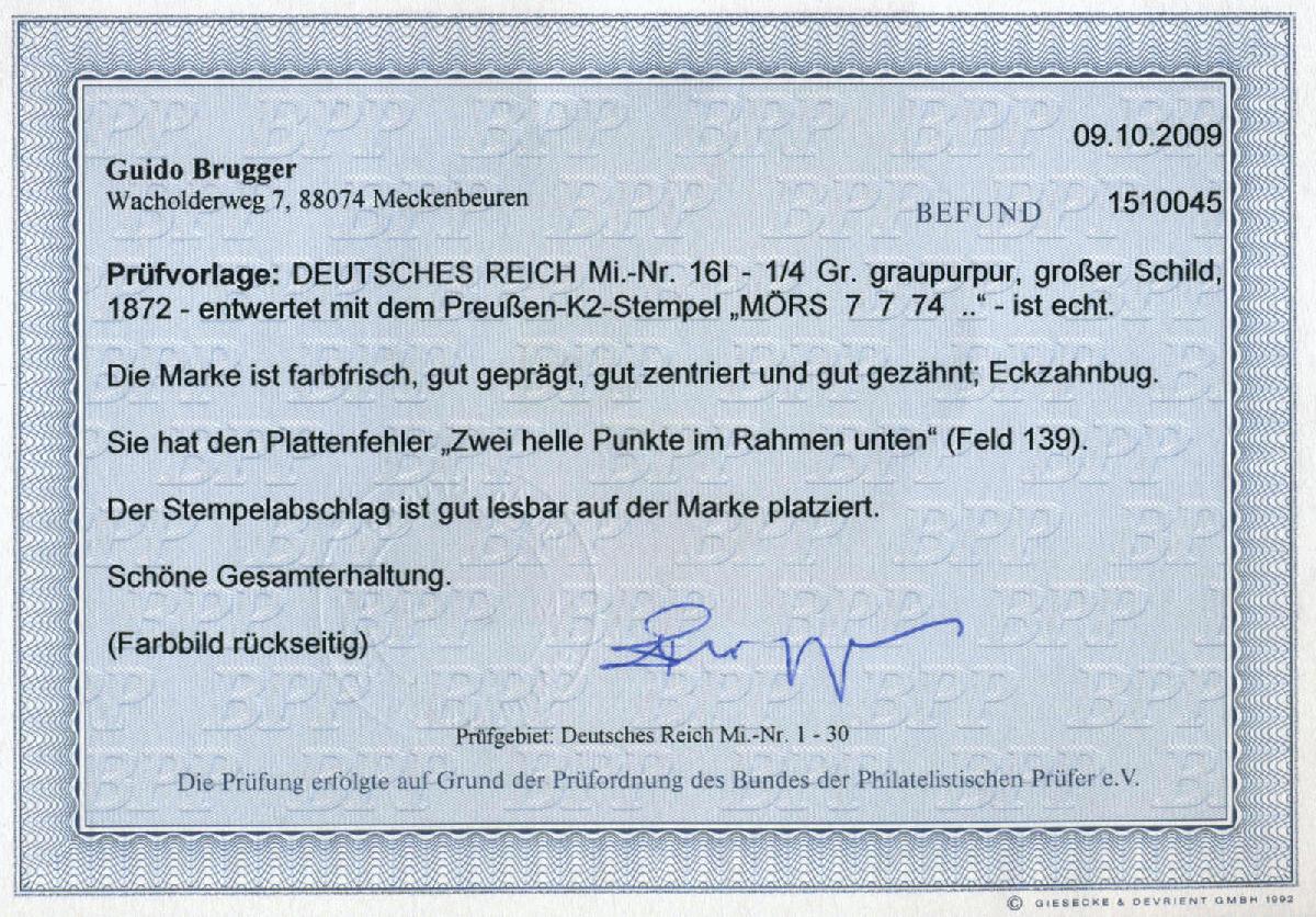 | Zusatzinformationen und Suchstichworte: | 75. AAK Phila GmbH Auktion 9. September 2022 Los 1787 (D) Deutsches Reich, 1872 Grosser Brustschild 1/4 Gr gr. Schild m. zentr. Preußen-K2 MÖRS m. seltenem PF "2 Pkte. im Rahmen" m. Befund Brugger BPP "echt, farbfrisch, gut geprägt, zentriert u. gezähnt, Eckzahnbug, schöne Gesamterhaltung" Ausruf 50,00 EUR |