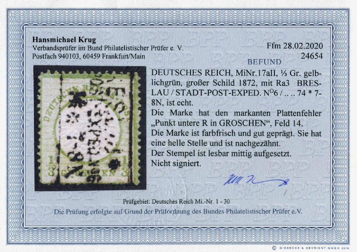 | Zusatzinformationen und Suchstichworte: | 75. AAK Phila GmbH Auktion 9. September 2022 Los 1791 (D) Deutsches Reich, 1872 Grosser Brustschild 1/3 Gr gr. Schild m. Ra3 BRESLAU m. selt. PF "Pkt. unter R" m. Befund Krug BPP "echt, farbfrisch, gut geprägt, helle Stelle u. nachgezähnt" Ausruf 25,00 EUR |