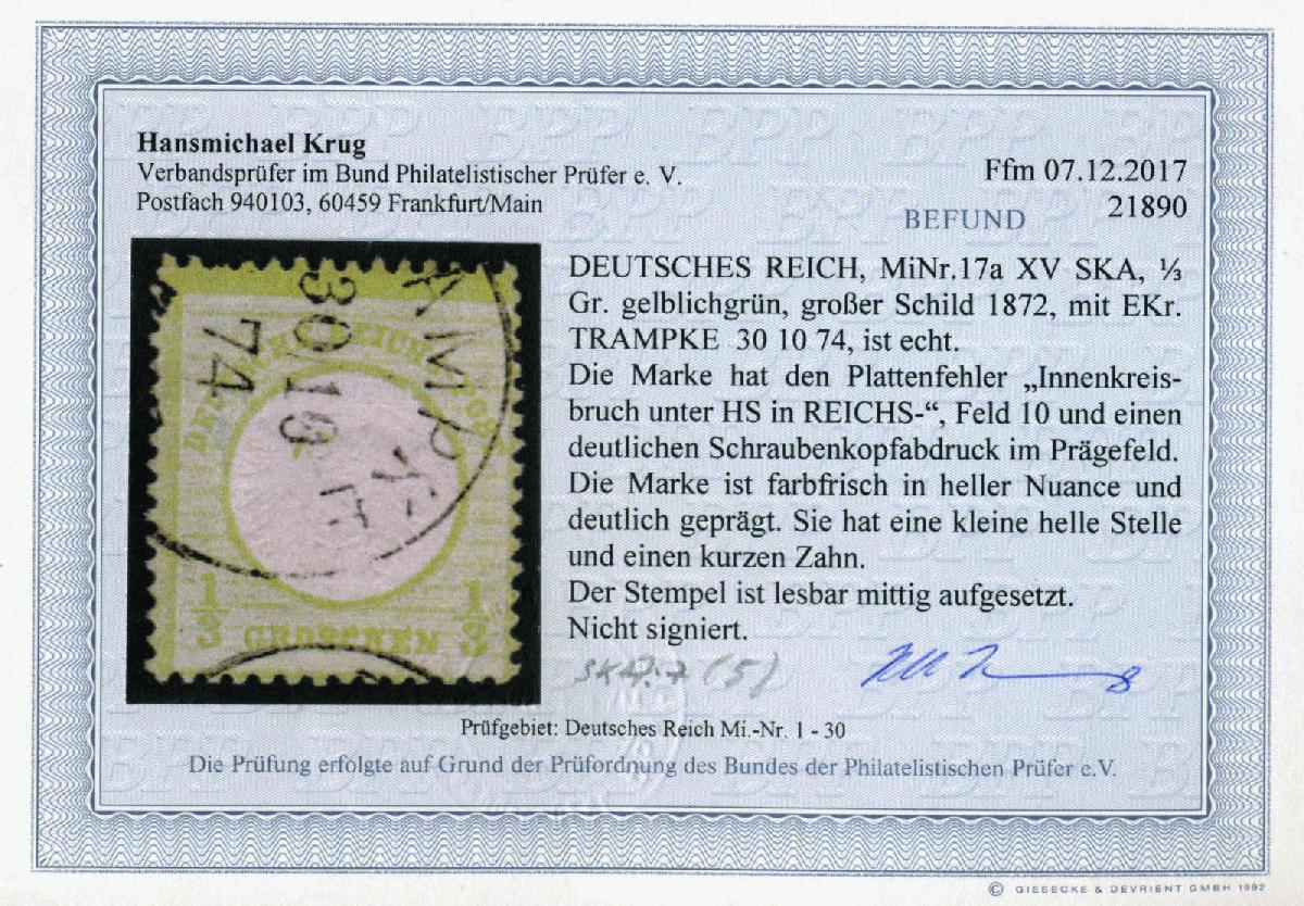 | Zusatzinformationen und Suchstichworte: | 75. AAK Phila GmbH Auktion 9. September 2022 Los 1801 (D) Deutsches Reich, 1872 Grosser Brustschild 1/3 Gr gr. Schild m. K1 TRAMPKE m. PF "Innenkreisbruch" u. Schraubenkopfabdruck m. Befund Krug BPP "echt, farbfrisch, deutlich geprägt, kl. helle Stelle u. 1 kurzer Zahn" Zuschlag 42,00 EUR |