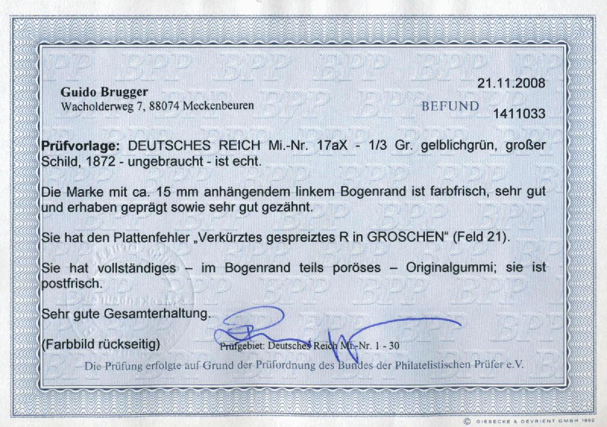 | Prüfer: | Brugger, Guido (BPP (Bund Philatelistischer Prüfer)) |