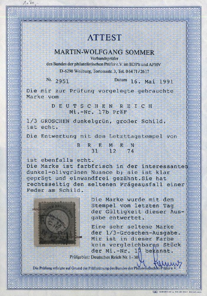 | Zusatzinformationen und Suchstichworte: | 75. AAK Phila GmbH Auktion 9. September 2022 Los 1811 (D) Deutsches Reich, 1872 Grosser Brustschild 1/3 Gr gr. Schild in interessanter dunkel-olivgrüner Nuance m. Prägeausfall einer Feder im Schild und m. Letzttagsstpl. BREMEN 31/12/74 m. einwandfreiem FA Sommer BPP "kein vergleichbares Stück bekannt", Unikats-Charakter durch Farbe, Prägefehler und Stempel!!! RR Ausruf 350,00 EUR |
