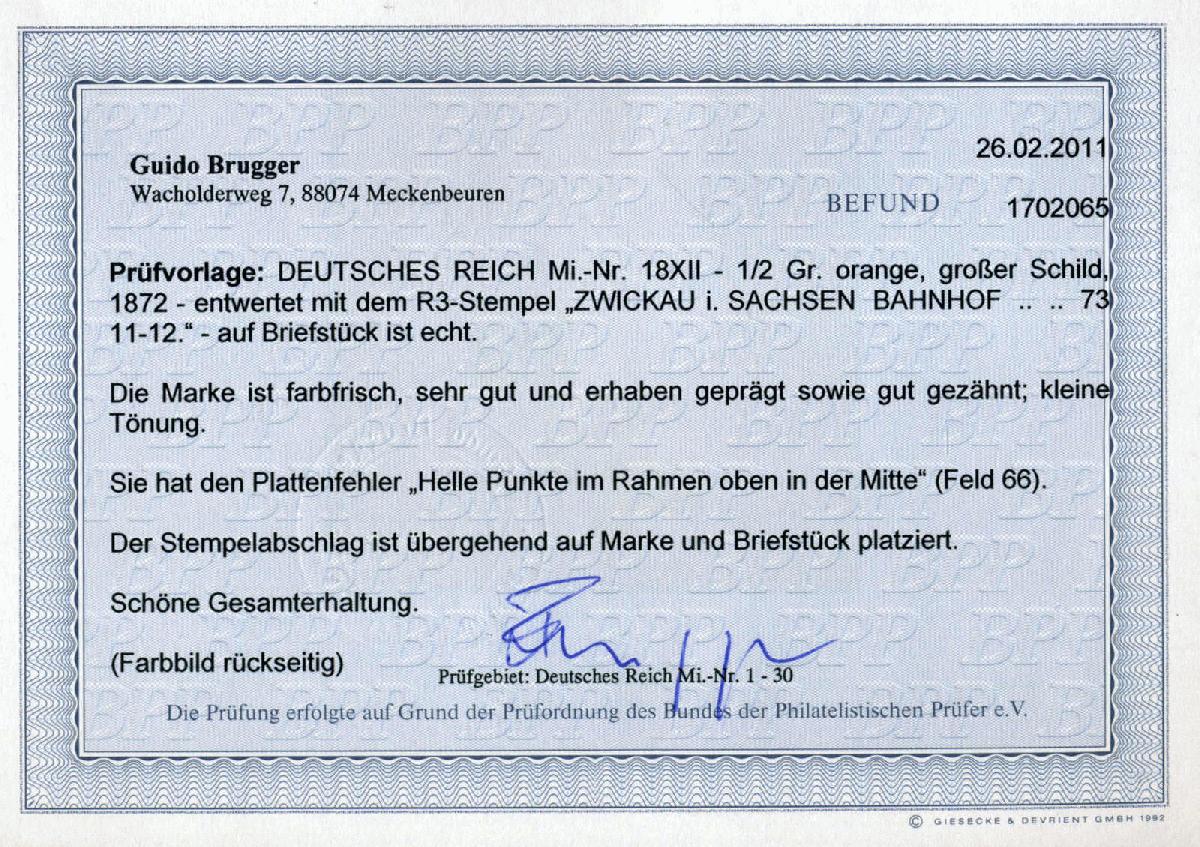 | Prüfgebiet: | Deutsches Reich 1871 - 1918 (Mi-Nr. 1 - 106) |