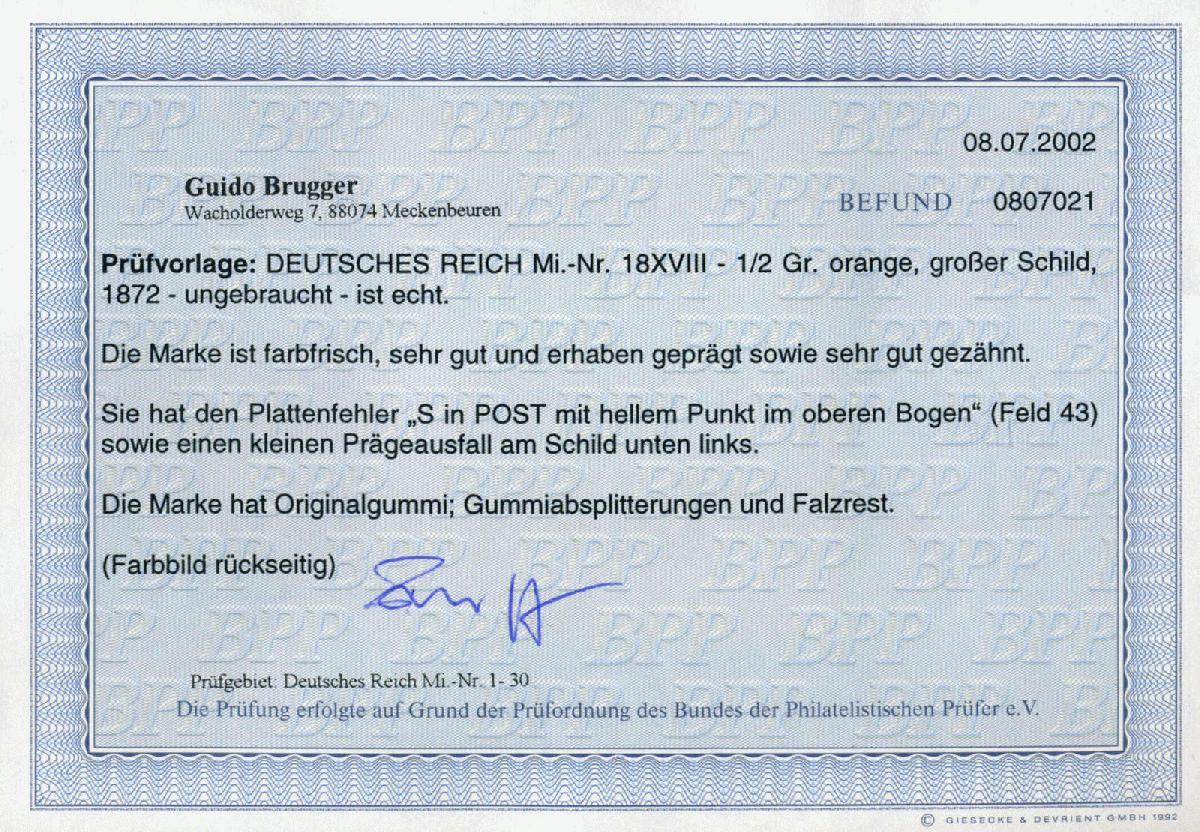 | Prüfgebiet: | Deutsches Reich 1871 - 1918 (Mi-Nr. 1 - 106) |