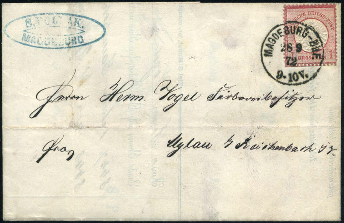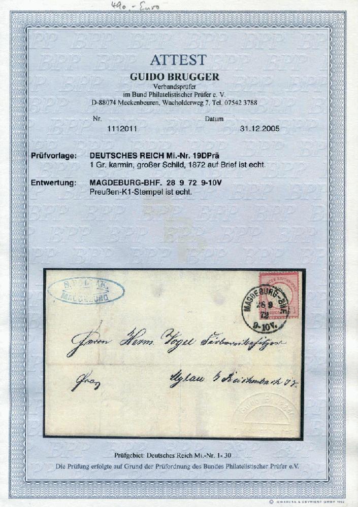 | Zusatzinformationen und Suchstichworte: | 75. AAK Phila GmbH Auktion 9. September 2022 Los 1853 (D) Deutsches Reich, 1872 Grosser Brustschild 1 Gr gr. Schild m. Doppelprägung auf portoger. Bf. v. Magdeburg n. Eylau m. einwandfreiem FA Brugger BPP "sehr gute Gesamterhaltung" Ausruf 150,00 EUR |