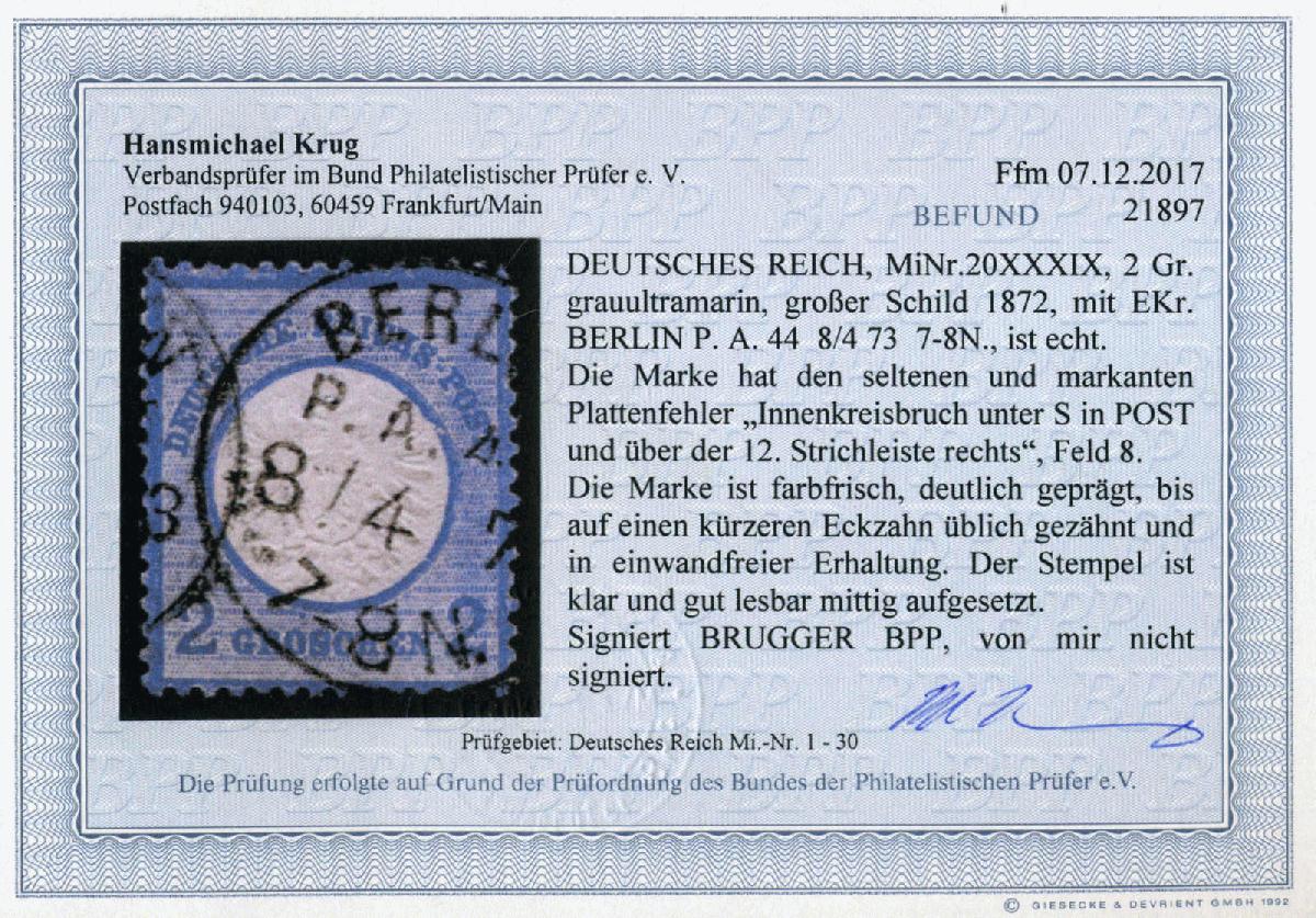 | Zusatzinformationen und Suchstichworte: | 75. AAK Phila GmbH Auktion 9. September 2022 Los 1898 (D) Deutsches Reich, 1872 Grosser Brustschild 2 Gr gr. Schild m. K1 BERLIN m. PF "Innenkreisbruch", tiefst gepr. Brugger BPP u. m. Befund Krug BPP "echt, farbfrisch, deutlich geprägt, bis auf 1 kürzeren Eckzahn übl. gezähnt, einwandfreie Erhaltung" Ausruf 60,00 EUR |
