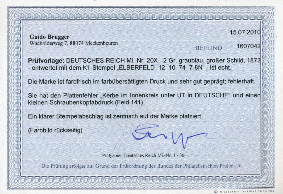 | Zusatzinformationen und Suchstichworte: | 75. AAK Phila GmbH Auktion 9. September 2022 Los 1913 (D) Deutsches Reich, 1872 Grosser Brustschild 2 Gr gr. Schild m. K1 ELBERFELD m. PF "Kerbe im Innenkreis" m. Befund Brugger BPP "echt, farbfrisch, farbübersättigter Druck, sehr gut geprägt, fehlerhaft re. Zahnmgl. u. dünn), m. markantem Schraubenkopfabdruck", R Ausruf 20,00 EUR |