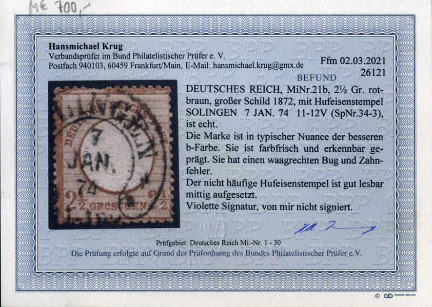 | Zusatzinformationen und Suchstichworte: | 75. AAK Phila GmbH Auktion 9. September 2022 Los 1922 (D) Deutsches Reich, 1872 Grosser Brustschild 2 1/2 Gr rotbraun m. zentr. Hufeisenstpl. SOLINGEN m. Befund Krug BPP "echt, farbfrisch, erkennbar geprägt, waagr. Bug u. Zahnfehler, Hufeisenstpl. nicht häufig", schöne Erscheinung! Ausruf 70,00 EUR |