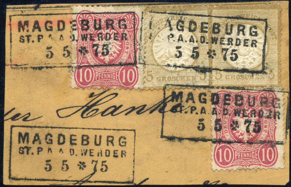| Zusatzinformationen und Suchstichworte: | 75. AAK Phila GmbH Auktion 9. September 2022 Los 1923 (D) Deutsches Reich, 1872 Grosser Brustschild 5 Gr gr. Schild u. 10 Pfge rosakarmin je 2x auf außergewöhnlichem Pracht-Bfstck. Magdeburg m. FA Sommer BPP "echt, sehr seltene Stempel-Sondertype P.A.A.D. WERDER, sehr gut geprägt, re. Marke m. Prägeausfall, MiF m. 5 Gr sind sehr selten, nur wenige registriert" Ausruf 150,00 EUR |