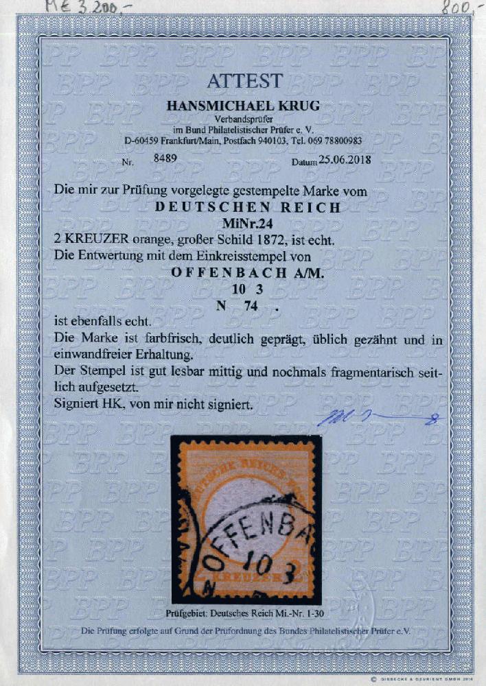 | Zusatzinformationen und Suchstichworte: | 75. AAK Phila GmbH Auktion 9. September 2022 Los 1944 (D) Deutsches Reich, 1872 Grosser Brustschild 2 Kr gr. Schild m. K1 OFFENBACH gepr. HK u. m. FA Krug BPP "echt, farbfrisch, deutlich geprägt, übl. gezähnt, einwandfreie Erhaltung", einwandfrei RR! Zuschlag 1.050,00 EUR |
