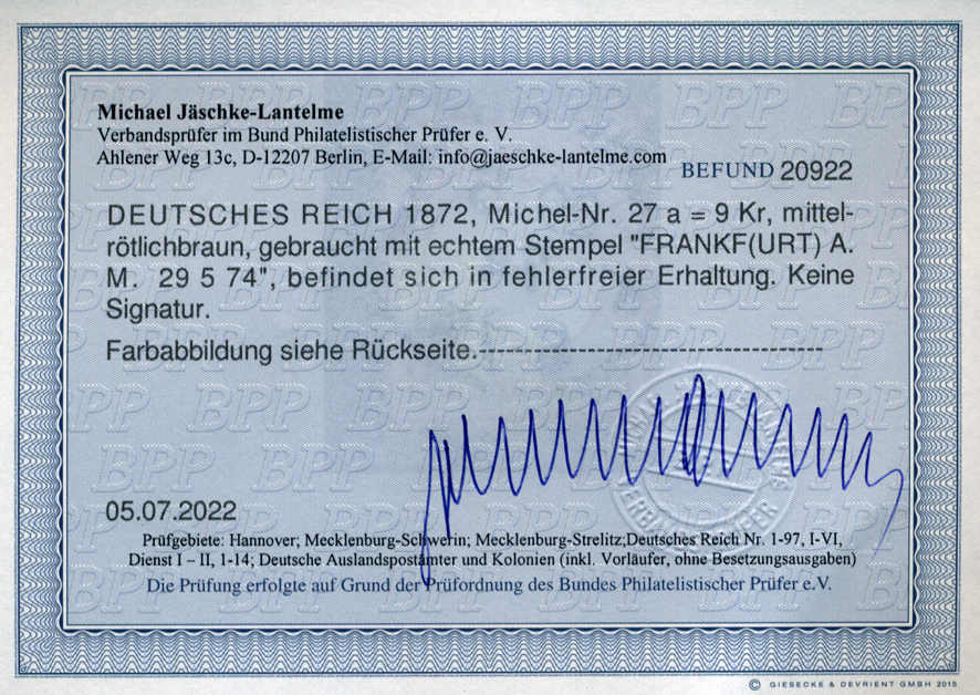 | Prüfer: | Jäschke-Lantelme, Michael (BPP (Bund Philatelistischer Prüfer)) |