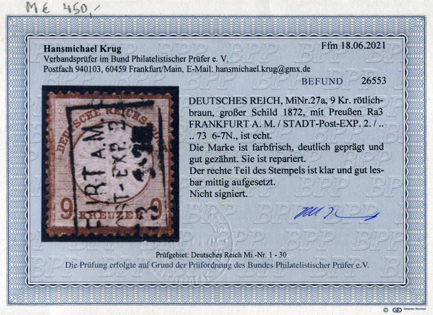 | Prüfer: | Krug, Hansmichael (BPP (Bund Philatelistischer Prüfer)) |