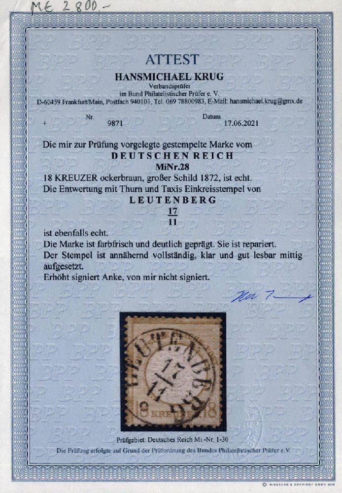 | Zusatzinformationen und Suchstichworte: | 75. AAK Phila GmbH Auktion 9. September 2022 Los 1968 (D) Deutsches Reich, 1872 Grosser Brustschild 18 Kr gr. Schild m. zentr. T&T-K1 LEUTENBERG, sign. Anke u. m. FA Krug BPP "echt, farbfrisch, deutlich geprägt, repariert", optisch sehr ansprechendes Stück dieses Spitzenwertes! Zuschlag 230,00 EUR |