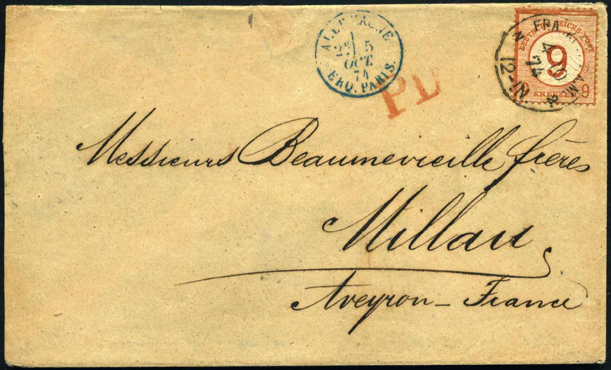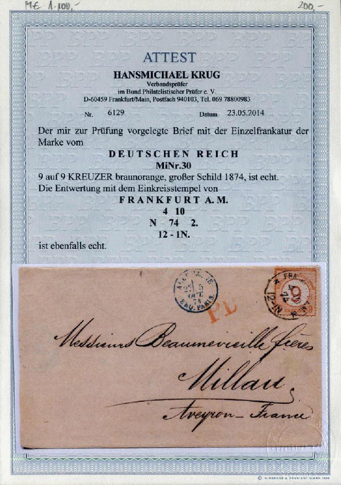 | Zusatzinformationen und Suchstichworte: | 75. AAK Phila GmbH Auktion 9. September 2022 Los 1993 (D) Deutsches Reich, 1872 Grosser Brustschild 9 a. 9 Kr braunorange als selt. portoger. EF a. Auslands-Bf. v. Ffm. n. Millau/F m. FA Krug BPP "Umschlag gestützt, Marke einwandfr.", R Ausruf 275,00 EUR |