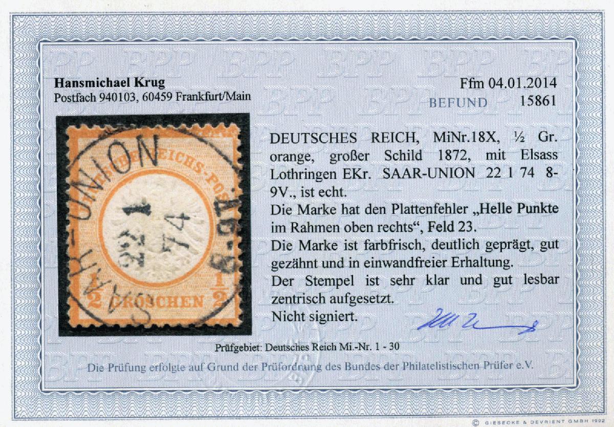 | Zusatzinformationen und Suchstichworte: | 75. AAK Phila GmbH Auktion 9. September 2022 Los 3825 (D) Deutsches Reich, 1872 Grosser Brustschild SAAR-UNION, seltener Elsass-Lothringen-Stpl. ideal zentr. a. 1/2 Gr gr. Schild m. PF "helle Pkte. im Rahmen" m. einwandfreiem Befund Krug BPP "farbfrisch, deutlich geprägt, gut gezähnt", Traumoptik! Ausruf 30,00 EUR |