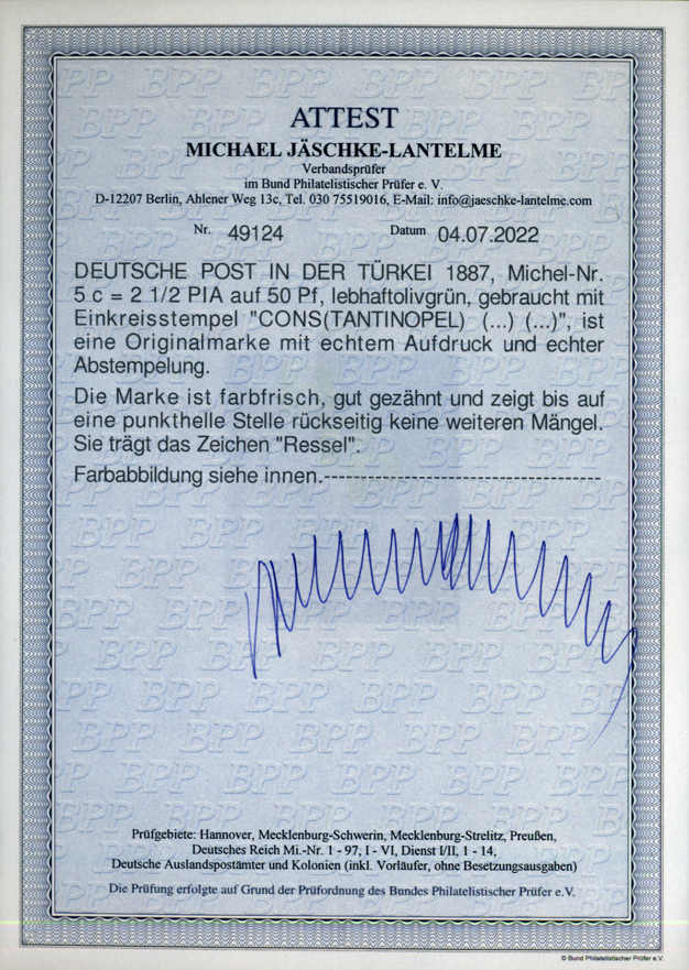 | Zusatzinformationen und Suchstichworte: | 75. AAK Phila GmbH Auktion 9. September 2022 Los 4301 (D) Deutsche Auslandspost Türkei 2 1/2 PIA a. 50 Pf lebh´olivgrün, rundgest. Pracht, tiefst gepr. Ressel, sowie neuestes FA Jäschke-L. BPP "echt, farbfrisch, gut gezähnt, bis auf eine punkthelle Stelle rs. (sehr penibel) keine weiteren Mängel", RR Zuschlag 920,00 EUR |