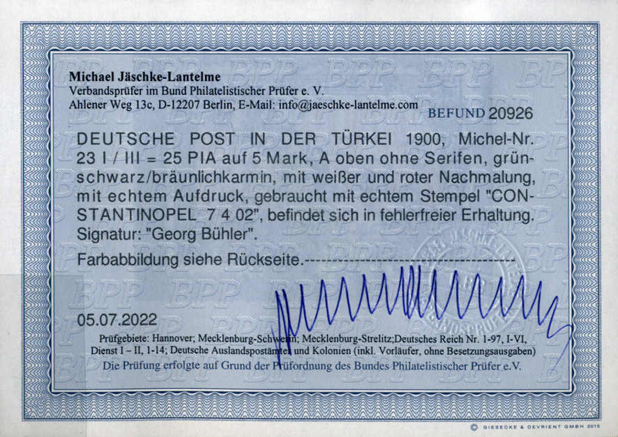| Prüfer: | Jäschke-Lantelme, Michael (BPP (Bund Philatelistischer Prüfer)) |