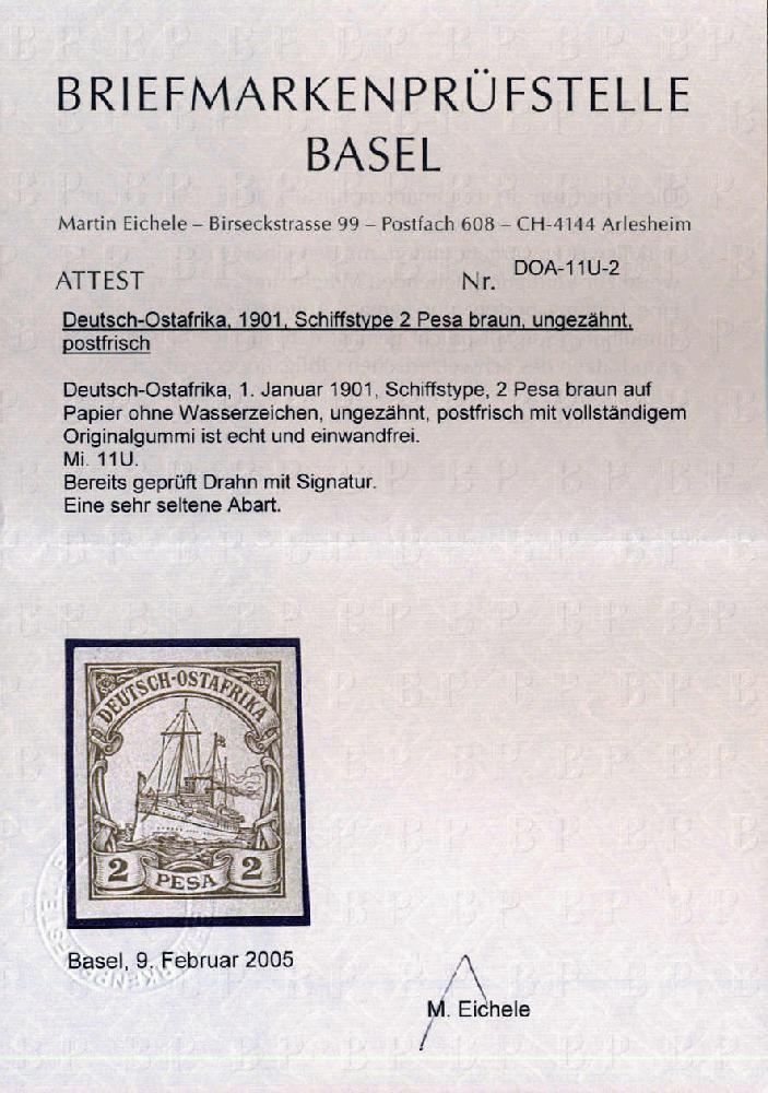 | Zusatzinformationen und Suchstichworte: | 75. AAK Phila GmbH Auktion 9. September 2022 Los 4373 D Deutsche Kolonien Ostafrika 2 P Kaiseryacht, ungezähnter Probedruck mit vollem Orig´gummi gepr. Drahn u. mit einwandfreiem FA BPSB für eine postfr. Exemplar, u.E. winzigste Springfalzspuren, daher nur ungebr. bewertet! (Michel f. ** 5.000€!!!), Top-Rarität! Ausruf 1.000,00 EUR |