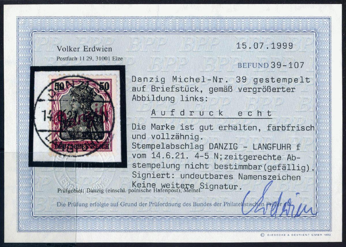 | Prüfer: | Erdwien, Volker (BPP (Bund Philatelistischer Prüfer)) |