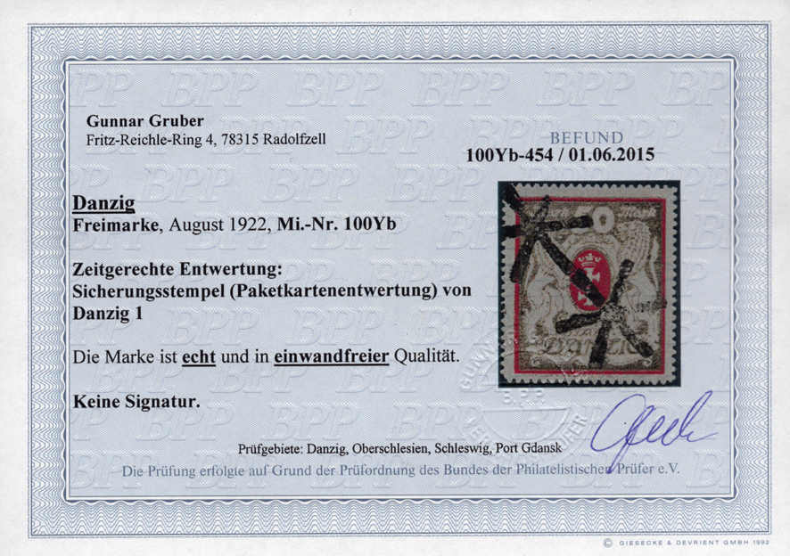 | Zusatzinformationen und Suchstichworte: | 75. AAK Phila GmbH Auktion 9. September 2022 Los 4620 (D) Danzig 50 M lilarot/gold, 2x Korkstpl., Luxus m. einwandfreiem Befund Gruber BPP Ausruf 75,00 EUR |