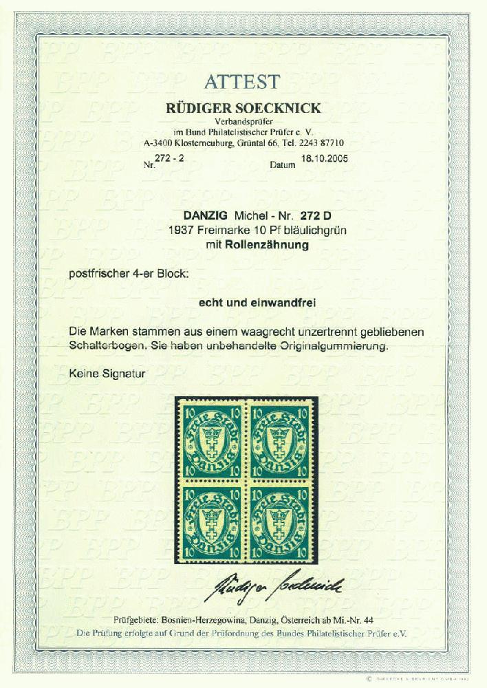 | Zusatzinformationen und Suchstichworte: | 75. AAK Phila GmbH Auktion 9. September 2022 Los 4686 (D) Danzig 10 Pf bläul´grün m. Rollenzähnung im 4er-Bl., postfr. Luxus m. einwandfreiem FA Soecknick BPP Ausruf 125,00 EUR |
