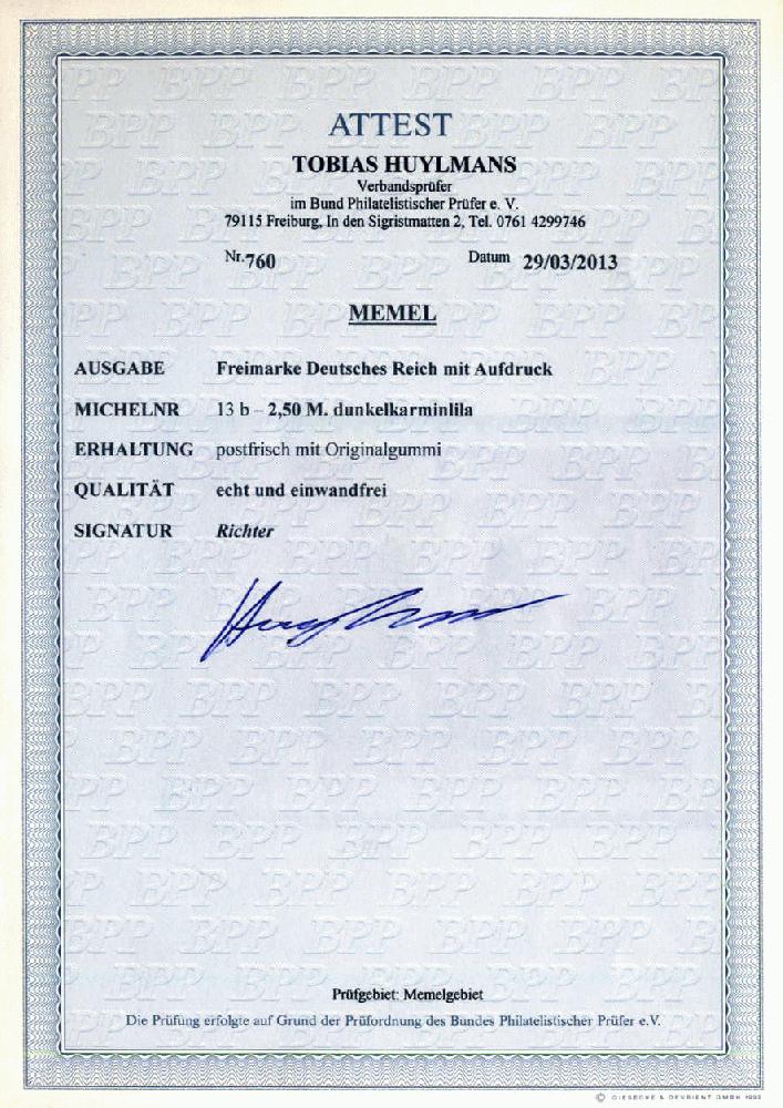 | Zusatzinformationen und Suchstichworte: | 75. AAK Phila GmbH Auktion 9. September 2022 Los 4737 (D) Memel 2,50 M dkl´braunlila, postfr. Luxus, gepr. Richter u. einwandfreies FA Huylmans BPP Ausruf 300,00 EUR |