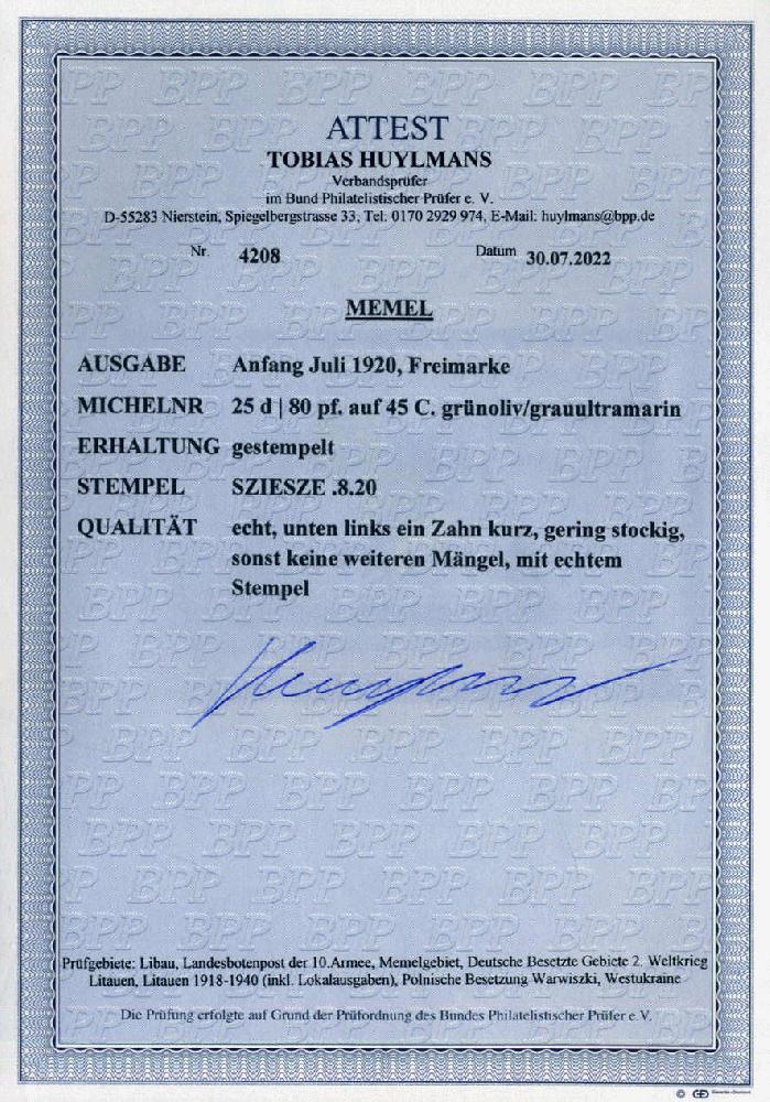 | Zusatzinformationen und Suchstichworte: | 75. AAK Phila GmbH Auktion 9. September 2022 Los 4751 (D) Memel 80 pf a. 45 C Freimarken in bester Type, rundgest. Pracht SZIESZE (li.u. 1 Zahn kurz, gering Stockig) m. entspr. FA Huylmans BPP, RR, fehlt immer! Zuschlag 310,00 EUR |