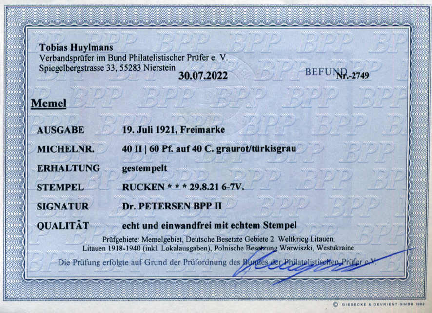 | Zusatzinformationen und Suchstichworte: | 75. AAK Phila GmbH Auktion 9. September 2022 Los 4772 (D) Memel 60 Pf a. 40 C graurot/türkisgrau in Type II, ideal zentr. rundgest. Luxus RUCKEN, tiefst gepr. Petersen BPP u. m. einwandfreiem Befund Huylmans BPP, Traumoptik! Zuschlag 125,00 EUR |