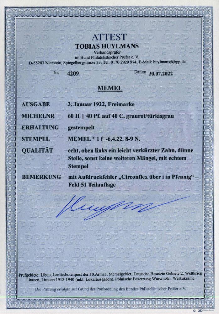 | Zusatzinformationen und Suchstichworte: | 75. AAK Phila GmbH Auktion 9. September 2022 Los 4782 (D) Memel 40 Pf a. 40 C Freimarken m. seltenem Aufdruckfehler "Circonflex über i", ideal zentr. rundgest. Pracht (li.o. verkürzter Zahn, dünne Stelle) m. entspr. FA Huylmans BPP Ausruf 120,00 EUR |
