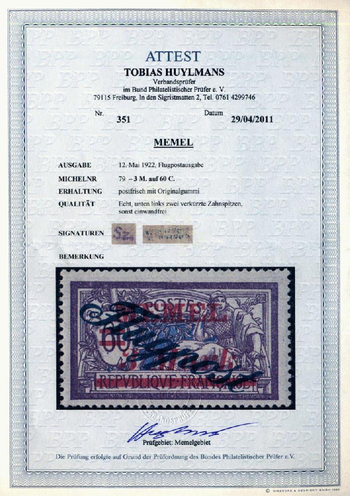 | Zusatzinformationen und Suchstichworte: | 75. AAK Phila GmbH Auktion 9. September 2022 Los 4784 (D) Memel 3 M a. 60 C grauviolett/kobalt, postfr. Pracht m. FA Huylmans BPP "echt, li.u. 2 verkürzte Zahnspitzen, sonst einwandfrei", R Zuschlag 90,00 EUR |