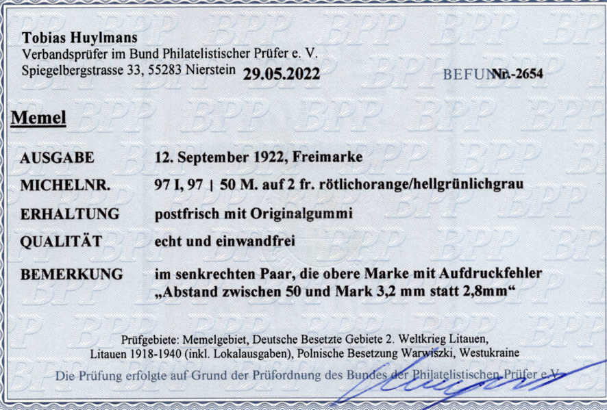 | Zusatzinformationen und Suchstichworte: | 75. AAK Phila GmbH Auktion 9. September 2022 Los 4788 (D) Memel 0 M auf 2 Fr Freimarke m. PF I im senkr. Paar, postfr. Luxus m. einwandfreiem FB Huylmans BPP Zuschlag 70,00 EUR |