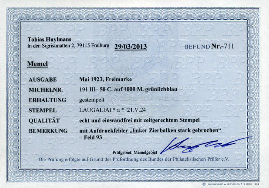 | Zusatzinformationen und Suchstichworte: | 75. AAK Phila GmbH Auktion 9. September 2022 Los 4850 (D) Memel 50 C a. 1000 M grünlichblau, rundgest. Luxus LAUGALIAI m. Aufdruckfehler "li. Zierbalken gebrochen" m. einwandfr. Befund Huylmans BPP Ausruf 50,00 EUR |