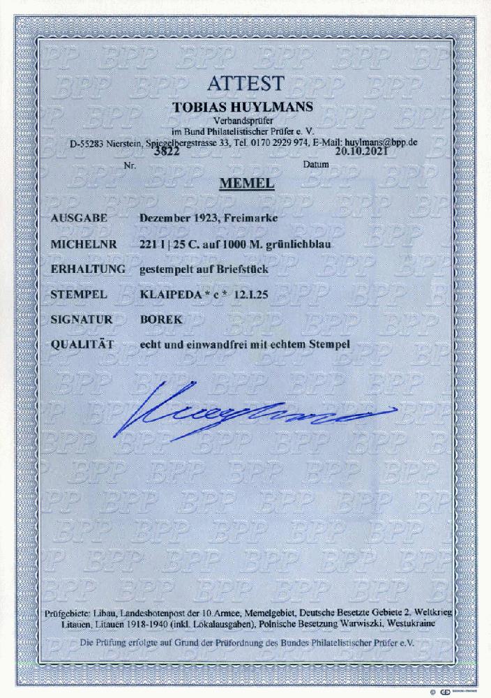 | Zusatzinformationen und Suchstichworte: | 75. AAK Phila GmbH Auktion 9. September 2022 Los 4877 (D) Memel 25 C a.1000 M grünl´blau a. Luxus-Bfstck., gepr. Borek u. einwandfreies FA Huylmans BPP Ausruf 180,00 EUR |