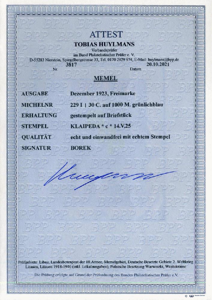 | Zusatzinformationen und Suchstichworte: | 75. AAK Phila GmbH Auktion 9. September 2022 Los 4880 (D) Memel 30 C a. 1000 M blau, Luxus-Bfstck., gepr. Borek u. m. einwandfreiem FA Huylmans BPP Ausruf 180,00 EUR |