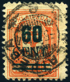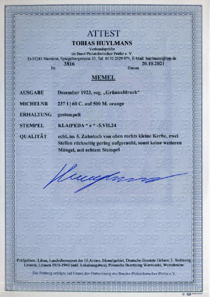 | Zusatzinformationen und Suchstichworte: | 75. AAK Phila GmbH Auktion 9. September 2022 Los 4900 (D) Memel 60 C a. 500 M orange, zentr. rundgest. Pracht m. FA Huylmans BPP "echt, kl. Kerbe im 5. Zahnloch, rs. gering aufgerauht, keine weiteren Mängel, echter Stempel", R Ausruf 300,00 EUR |