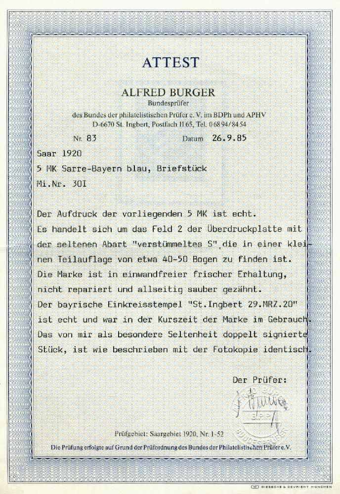 | Zusatzinformationen und Suchstichworte: | 75. AAK Phila GmbH Auktion 9. September 2022 Los 4989 (D) Saar 5 M Freimarke m. PF I verstümmeltes "S", Luxus-Bfstck. ST. INGBERT m. einwandfreiem FA Burger BPP Ausruf 600,00 EUR |