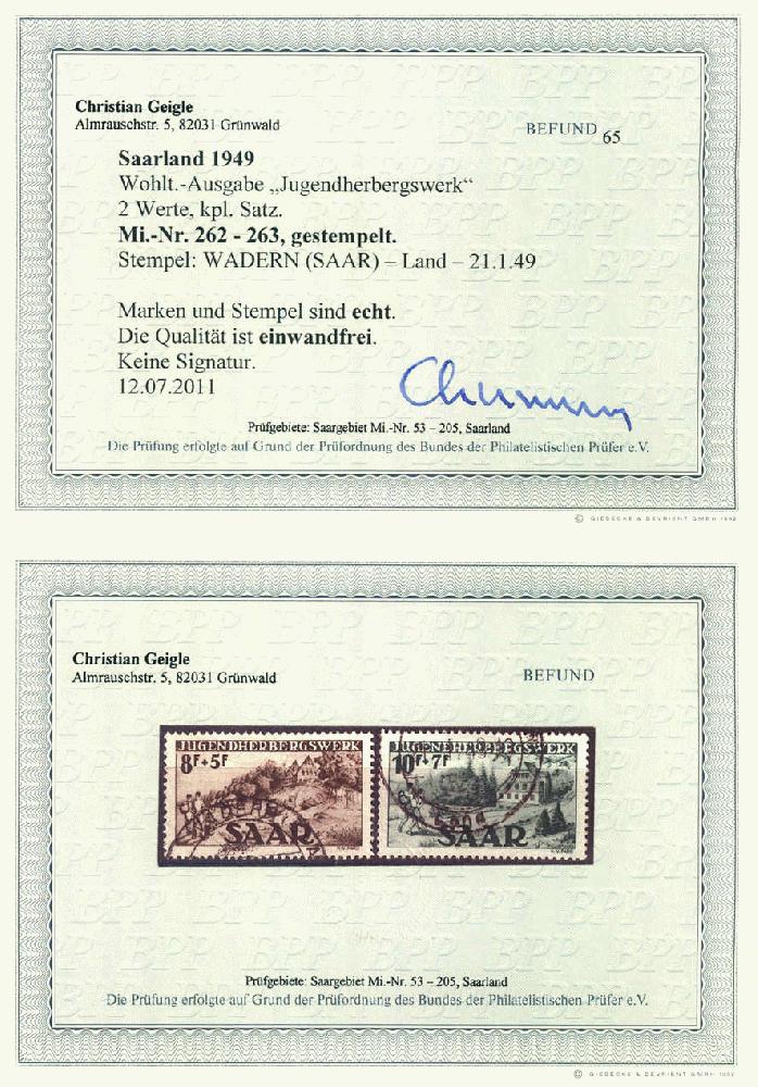 | Zusatzinformationen und Suchstichworte: | 75. AAK Phila GmbH Auktion 9. September 2022 Los 5157 (D) Saar 1949 Jugendherbergswerk, rundgest. Luxus, Befund Geigle „echt u. einwandfrei” Ausruf 50,00 EUR |