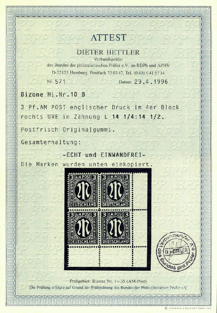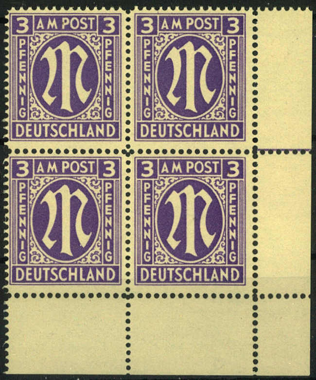 | Zusatzinformationen und Suchstichworte: | 75. AAK Phila GmbH Auktion 9. September 2022 Los 6580 (D) Bizone 3 Pf AM-Post in bester Type im 4er-Bl. re.u.Ecke, postfr. Luxus m. einwandfreiem FA Hettler BPP Ausruf 50,00 EUR |