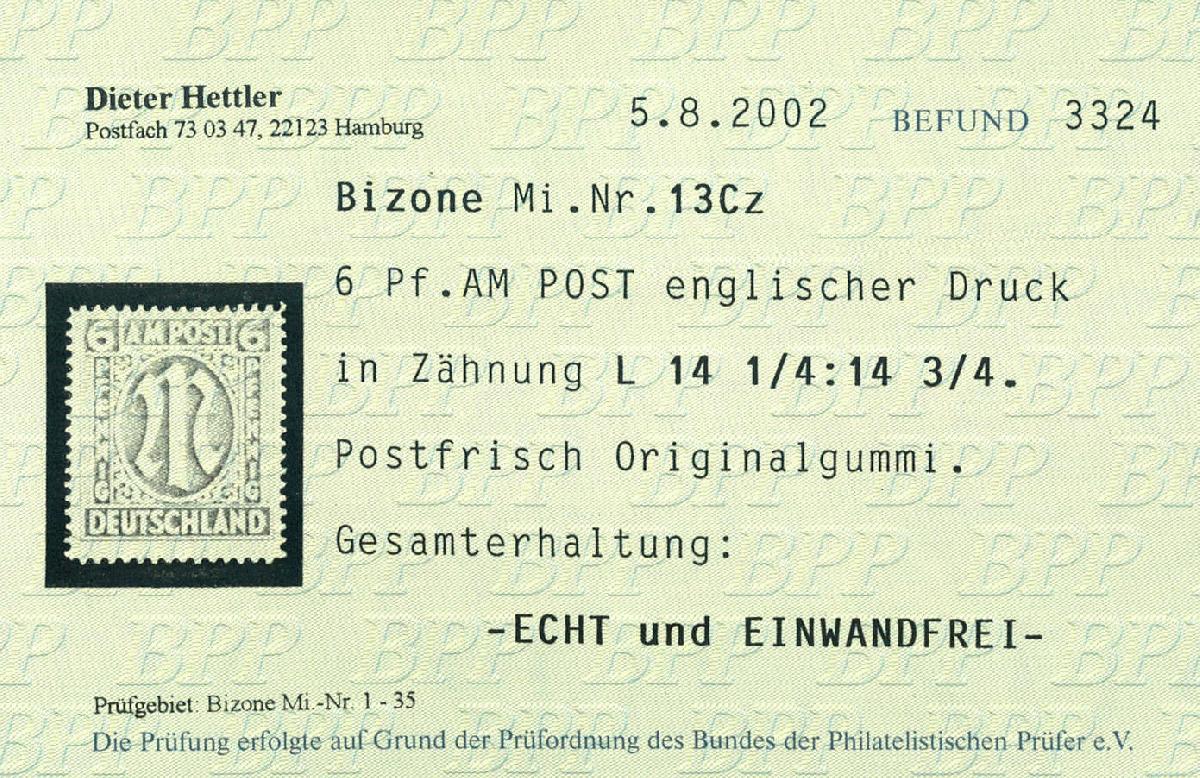| Zusatzinformationen und Suchstichworte: | 75. AAK Phila GmbH Auktion 9. September 2022 Los 6590 (D) Bizone 6 Pf AM-Post, zweitbeste Zähnung, postfr. Luxus m. einwandfreiem Befund Hettler BPP Ausruf 40,00 EUR |