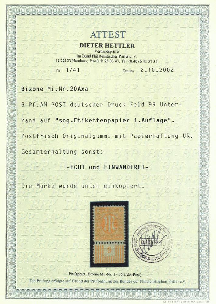 | Zusatzinformationen und Suchstichworte: | 75. AAK Phila GmbH Auktion 9. September 2022 Los 6632 (D) Bizone 6 Pf AM-Post v. Unterrand (hier Haftstelle) in bester Type, Marke postfr. Luxus m. einwandfreiem FA Hettler BPP Ausruf 100,00 EUR |